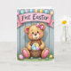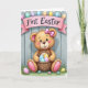Designed with a cozy pastel look, this Easter card features a plush-textured brown bear wearing a pink bow, sitting on fresh green grass with rosy paw pads showing. The bear’s bright eyes, rosy cheeks, and open smile give it a sweet, friendly charm, like it’s happily sharing a spring treat 🐰. In its paws, it holds a woven basket filled with patterned eggs in soft blues, purples, mint greens, and gentle yellows. Behind the bear, a slightly weathered blue-gray wooden fence sets a calm outdoor scene, with a few decorated eggs resting along the fence rail and tucked into the grass. Near the top, a pink ribbon banner stretches across with a short Easter greeting printed in a darker pink, centered above the bear. The overall layout feels light and airy, with the bear placed in the middle and the details balanced around it for a warm, companionable mood 🌷. The fence boards show subtle texture lines, and small pastel eggs dot the foreground among blades of grass.
