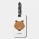 A cute bear luggage tag with a customizable name. It features a bear face cartoon illustration and the name in brown text.