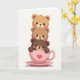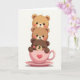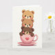 This Valentine’s Day greeting card features three teddy bears stacked in a sweet little tower against a bright white background. The top bear is light tan with wide eyes and rosy cheeks, looking straight ahead with a friendly, gentle expression. The middle bear is a warm medium brown and shares the same soft, caring look, creating a smooth shift in color. At the bottom, a dark brown bear rests inside a pastel pink teacup, eyes closed and smiling as if it feels safe and cozy. A red heart decorates the front of the teacup, which sits on a matching saucer, adding a warm romantic detail ❤️🍫. There is no text on the front, letting the bears and heart share the message on their own. It’s a comforting, affectionate card that works beautifully for Valentine’s Day, friendship, or a thoughtful note to someone special