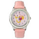 A watch with a sweet image of a pink and white striped bumble bee. A piece of yellow honeycomb behind. A letter sealed with a heart and a group of floating hearts are also part of the design.