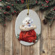 On the front of this Holiday ornament is an image of an adorable Bichon Frise puppy dog peeking out of a red and white Christmas gift bag. The bag is nestled among pine boughs and pine cones. Behind the image is a gold confetti sprinkle background. The back of the ornament has several text fields for you to personalize each ornament. Perfect for a daughter, son, niece, nephew, granddaughter or grandson who loves dogs.
