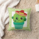 A pillow with a cute illustration of a green cactus sitting in a flower pot. Big kawaii eyes and wearing a red sombrero. The background is a pattern with lime green swirls.