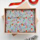 A cute bird botanical family gift wrap wrapping tissue paper for Christmas holiday featuring cute hand painted red robin bird illustration on a blue snow background sky, leaves and berries on tree branches. Original artwork by Caroline Bonne Müller