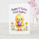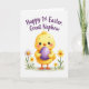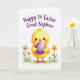 This greeting card features a fluffy yellow baby bird at the center, standing on a white background among spring flowers and fresh green grass 🌷. Its rounded body is shaded with soft texture, and faint pink blush on its cheeks adds a tender, friendly look to its big dark eyes. Nestled in its wings is a purple speckled egg, held close like a small gift shared between close friends. White daisies and smaller yellow blossoms dot the ground around it, creating a gentle garden setting that feels sweet and companionable 🐰. Near the top, a short greeting appears in flowing purple lettering, centered above the illustration. The purple text echoes the egg’s color, tying the design together without crowding the scene. Thin green stems and blades of grass sit beneath the bird’s feet, with petals and blooms scattered lightly to either side.