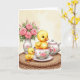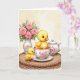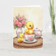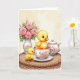 This card features two fluffy yellow baby birds posed like close friends, one nestled inside a white teacup while the other stands nearby with a gentle, attentive tilt of its head 🌷. The bird in the cup has large blue eyes and tiny orange feet peeking over the rim, giving the scene a sweet, affectionate energy. Pink roses and soft green leaves decorate the teacup, and the pair sits on a round woven tray that adds a cozy, natural touch. On the left side, a white vase holds a bouquet of pink roses and slender buds, echoing the floral pattern and suggesting a shared, romantic garden moment. In the background, a matching white teapot rests farther back, softly blurred to keep attention on the two little companions 🐇. The greeting text sits near the top in a light pastel pink, with a smaller line of text centered near the bottom in muted gray. A creamy, softly lit backdrop surrounds the porcelain pieces, with delicate rose petals and leaf details visible along the cup’s outer curve.