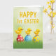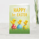 This design shows three round, cartoon-style yellow chicks lined up side by side, each perched on a large decorated egg as if sharing a sweet moment together 🐰. Their soft-looking feathers, wide dark eyes, and tiny orange beaks give them a gentle, friendly look, and the chick on the left has a faint blush that reads like shy affection. The eggs beneath them are glossy and colorful: one red with small white dots, one blue with white dots, and one yellow with larger blue spots. A narrow band of textured green grass runs along the bottom, adding a springtime setting 🌷. The background fades in a light green gradient, keeping the scene bright and airy. Near the top, thick rounded lettering in golden yellow is centered and spaced to stand out clearly against the pale backdrop. The trio sits just above the grass line, with the shiny eggs forming a neat row across the lower middle of the card.