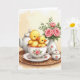 This card shows two fluffy yellow, bird-like creatures tucked inside a porcelain teacup, leaning close as if sharing a quiet, caring moment 🐇. The larger one faces forward with wide eyes and an orange beak, while the smaller one nestles against its side in a way that suggests trust and protection. To the left sits a white teapot with subtle decorative touches, and to the right a slim vase holds three open pink roses with green leaves 🌷. A small lidded sugar pot rests nearby, keeping the tabletop arrangement balanced and cozy. Everything sits on a textured woven mat that adds a rustic contrast to the smooth ceramics. The lighting is soft and diffused, bringing out gentle pastel tones in the whites, greens, and pinks while letting the yellow pair stand out. A short Easter greeting appears near the top in a light, spring-like color, with a smaller line of text centered near the bottom in a matching shade. The teacup and saucer show delicate rose motifs with fine accents around the rim and base.