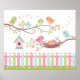 Cute bird scene with baby chicks in a nest, bird house and cute colourful fence.