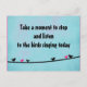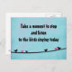 Cute birds singing postcard--encourage someone to take a moment to listen to the birds singing. Cute distressed blue postcard with the quote, 'take a moment to stop and listen to the birds singing today'. Sometimes, we just need a little perspective on life. Encouraging card for family and friends for all occasions.