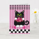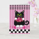 Cute card witl a vector illustration in trendy colors, showing a cat offering flowers. This product can be customized by changing the background colors and the text (inside the card)