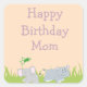 Cute birthday stickers for mom, this item features a peach background with green grass, a green front, and an elephant and hippo. "Happy Birthday Mom" is written in lovely purple font. Purchase yours today!