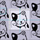 Fabric designed with an illustration of a smiling and waving kitty cat with a black spot around his ear. Purple background. Simple cute and adorable.