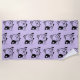 A patterned beach towel designed with an illustration of a smiling and waving kitty cat with a black spot around his ear. Purple background. Simple cute and adorable.