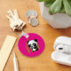 What a cute and adorable illustration of a black and white panda bear sitting amongst the green bamboo stalks in a little grove, looking happy, friendly and lovable. Fuschia pink background.