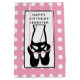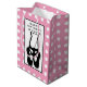 Birthday gift bag with a black illustration of a ballet dancers slippers and her lower legs which are transparent allowing the color of the background to show through. Ballerina is standing on her toes, en pointe. Background is a pattern made of white polka dots on pink.