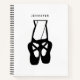 Spiral notebookwith a black illustration of a ballet dancers slippers and her lower legs which are transparent allowing the color of the background to show through. Ballerina is standing on her toes, en pointe.