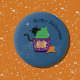 A cute Halloween button for kid with a black cat trying to secretly taste a cupcake with a green frosting . Also available in orange