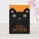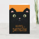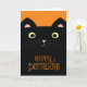 Cute, simple black cat illustration with Halloween-birthday-appropriate orange background and charming "Happy Birthday" text.