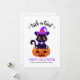 Add your own special touch to this fun Halloween design featuring a cute black kitty cat wearing a purple witch hat and sitting on a carved pumpkin with your name along with the words "trick or treat" in a modern script font and "Happy Halloween" in a playful font.