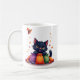 This adorable Halloween mug features a cute black kitten with big, glowing yellow eyes and rosy cheeks, sitting happily behind a pile of colorful goodie bags. The bags—purple, orange, and green with polka dots—overflow with festive candies. A tiny orange witch hat floats above, surrounded by bright starbursts and confetti.
