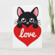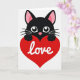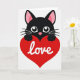 This Valentine’s Day card features a black cartoon cat peeking out from behind a large red heart on a bright white background. The cat’s wide white eyes and tiny black pupils give it a curious, gentle expression that draws you in right away. Soft pink details inside the ears and a small pink nose stand out against the dark fur, while thin white whiskers add a charming finishing touch. The bold red heart fills most of the card and sets a romantic tone. Centered across the heart, the word “love” is written in smooth white cursive lettering. It’s a warm, friendly design that’s perfect for sharing affection with someone special.