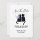 A whimsical Save the Date wedding card features two adorable black cats sitting sweetly inside a heart, with soft pastel accents, playful romantic details, and a fun pun "Getting Meow-ried".