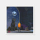 A cute black cat sits on a table gazing at a lit candle. Also on the table are a book, goblet, bottle, chest, hat and crystal ball with a crow sitting on top of it. A full moon shines in the window on the scene.