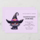 A birthday invitation with a fun Halloween illustration for cat lovers. A big-eyed black cat wearing a large black witch's hat with a purplish pink belt around the brim.