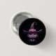 Button with a fun Halloween themed illustration for cat lovers. A big-eyed black cat wearing a large black witch's hat with a purplish pink belt around the brim.