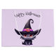 Gift bag with a fun Halloween themed illustration for cat lovers. A big-eyed black cat wearing a large black witch's hat with a purplish pink belt around the brim.
