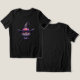 T-shirt with a fun Halloween themed illustration for cat lovers. A big-eyed black cat wearing a large black witch's hat with a purplish pink belt around the brim.