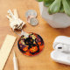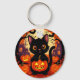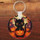 A delightful Halloween illustration featuring a playful black cat holding a glowing pumpkin, surrounded by spooky trees, bats, and jack-o'-lanterns, evoking festive and whimsical autumn vibes.