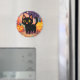 Add a dash of Halloween magic to any space with this adorable magnet design! A sweet, wide-eyed black cat stands happily among a patch of glowing jack-o’-lanterns—most in classic orange, with a few in playful pinks and cool blues. Above, a deep purplish-black sky sprinkled with twinkling stars adds a touch of night-time wonder. Perfect for cat lovers and fans of colorful, whimsical Halloween art.