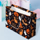 seamless pattern of Halloween illustrated cartoon on a black background. The cartoon characters include pumpkins, ghosts, bats, candy, spider webs, and stars. The icons are all drawn in a simple, cartoony style. The pattern is repeated seamlessly, so it can be used to fill a large area, such as a wall, fabric or a piece of paper. this pattern is good for party hats, wrapping papers, wrapping bags and more. Try this halloween gift bag, you won't regret it.