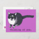 Painting of a cute black and white tuxedo cat done in pointillism, with Thinking of you, is printed on postcards. The text can be customized in the template box. The background color can also be customized.