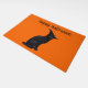 A cute black cat sits contentedly wearing a star and moon adorned black witches hat. The words Happy Halloween can easily be changed to any text.