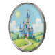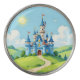 Cute blue and white castle with red flags on a bright summer day. This beautiful whimsical illustration with the sun, clouds, blue sky and green hill grass.
