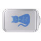 This awesome cake pan features a digital art image of a cute blue cat with a curly tail. His eyes are pale blue with black pupils. He is wearing a pink bow in his hair and a shining blue collar round his neck with a blue token on it.