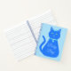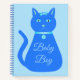 This awesome spiral notebook features a digital art image of a cute blue cat with a curly tail. His eyes are pale blue with black pupils. He is wearing a pink bow in his hair and a shining blue collar round his neck with a blue token on it.