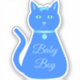 This awesome shaped sticker sheet features a digital art image of a cute blue cat with a curly tail. His eyes are pale blue with black pupils. He is wearing a pink bow in his hair and a shining blue collar round his neck with a blue token on it.