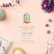 Blue acrylic baby shower invitation with a little chick hatching from its egg. The color palette is blue, yellow and orange. The illustration represents a baby chick hatching and the text reads " A little chick is about to hatch". Illustrated and designed by Patricia Alvarez.