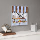 A cute art illustration of a bakery window. A variety of desserts are on display including a donut, cookies, danishes, cinnamon roll, pie, eclair, chocolates and candies. The color theme is mostly blue and brown. This design is also available in pink and brown. This whimsical wall clock works great for a kitchen wall, bakery or cafe. Artwork by Delightful-Doodles.