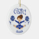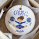 Blue & White Cheer Cute Blunette Cheerleader Ornament. Easy to personalize with your name & date. Visit our shop to view this ornament in a large variety of school colors & hair colors