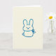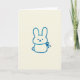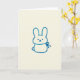 This card features a simple, front-facing long-eared bunny centered on a muted off-white background 🐰. The bunny is drawn with rounded contours and a medium blue outline that looks like it could have been made with a waxy crayon or soft pastel, giving the line a lightly textured feel. Its face uses two small dot eyes and a tiny “x” mouth, creating a calm, friendly expression that feels like an affectionate glance held just a moment longer. A small bow in the same blue line sits on the bunny’s right side just below the head, adding a gentle, sweet touch that suggests care and closeness. The wide open background leaves lots of breathing room, so the bunny’s shape feels like it’s quietly keeping someone company 🌷. There’s no additional scenery, just the centered figure and the soft contrast between the blue outline and the warm, pale backdrop. No text appears anywhere on the front, and the only extra detail is the blue bow tied neatly beside the bunny’s cheek.