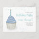 This design features a cute kids' boy cute cupcake invitation with birthday candle blue sprinkles, a QR code for more information and your party URL, and a Facebook icon for the social media events page. a whimsical fun party celebration, a stylish trendy calligraphy script, a creative dessert cake sweet treat, with colorful pastel colors typography design, an adorable birthday party kids' invitations, a watercolor teal frosting style, a birthday cupcake cake theme, for kids children birthday party budget friendly postcard invites