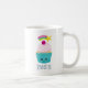 A personalized mug with a cute blue cupcake with pink frosting and a kawaii smiling face. A cherry on top also has a cute happy face. A shooting star is flying in the air.