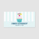 A name badge with with a light blue and white striped pattern paired with a blue and pink polka dot pattern. Layered over top is a cute blue cupcake with pink frosting and a kawaii smiling face. A cherry on top also has a cute happy face. A shooting star is flying in the air
