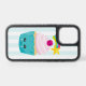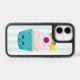 Otterbox phone case with a light blue and white striped background. Layered over top is a cute blue cupcake with pink frosting and a kawaii smiling face. A cherry on top also has a cute happy face. A shooting star is flying in the air