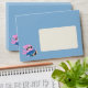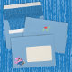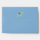 Cute Holidays light blue envelope with a cute cartoon penguin kid tangled in Christmas lights .