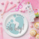 Cute and fun, these paper plates are the perfect accessory for any "it's a boy" baby shower. The design features a soft blue set of baby feet on the front with gray text to fit all of the baby shower details. The back features a matching blue background with white baby footprints.